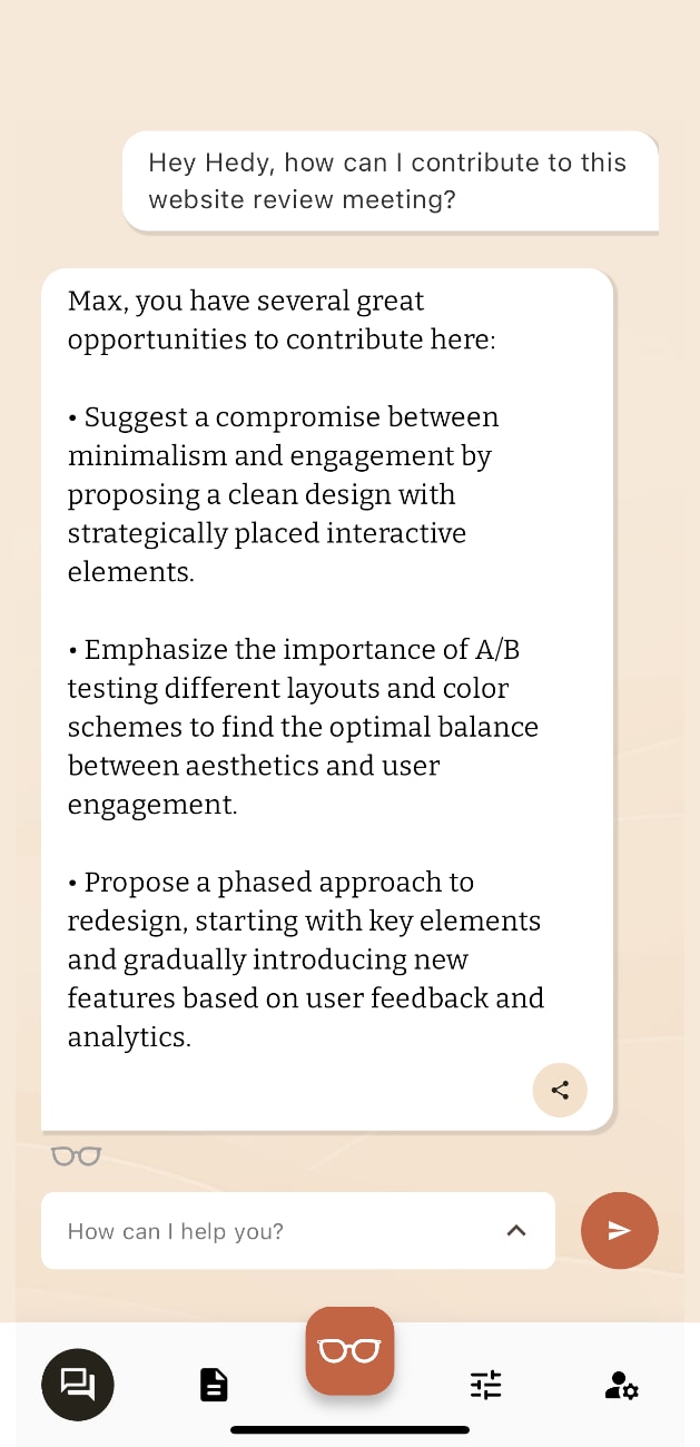 Hedy is particularly beneficial for professionals who juggle back-to-back meetings and need an edge in real-time decision-making. Hedy lets you be more engaged and actively participate in the conversation during the meeting, prompting you to ask not just “a question” but the right question.